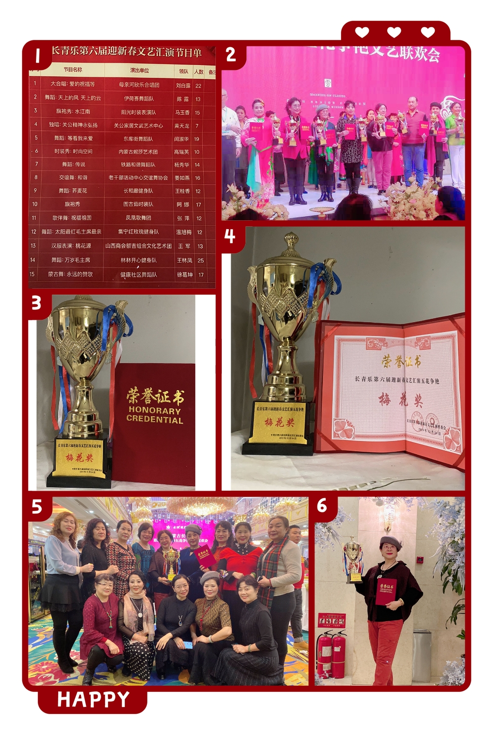 ; ; ;2019年12月24日,商会“额吉组合文化艺术团”团长王军带领部分艺术团成员应邀参加了“长青乐第六届迎新春文艺汇演五花争艳”活动。获得第一名“梅花奖”的好成绩。